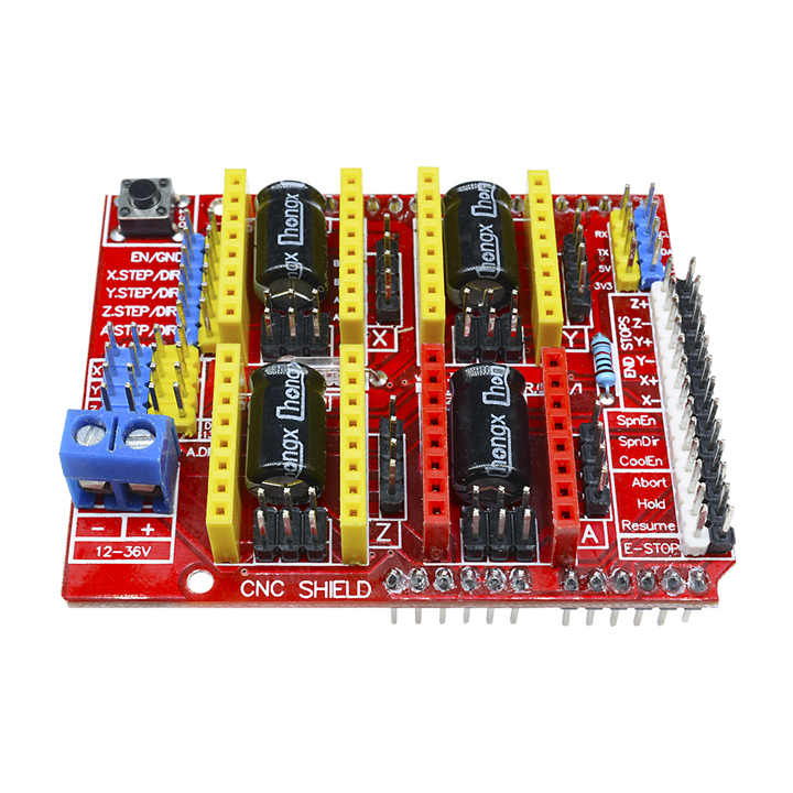 - Board Arduino CNC shield v3 là board mở rộng của Arduino UNO R3 dùng để điều khiển các máy CNC mini. Board có 4 khay dùng để cắm các mô đun điều khiển động cơ bước A4988, khi đó board có thể điều khiển3 trục X, Y, Z và thêm một trục thứ 4 tùy chọn trên các máy CNC mini.