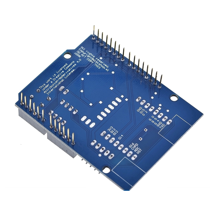 - Arduino ESP8266 Wifi Shield được tích hợp mạch nguồn riêng giúp ESP8266 hoạt động ổn định, đồng thời thiết kế Pin Out dạng rào cho tất cả các chân GPIO của ESP8266 giúp sử dụng dễ dàng, các chân GPIO đều có gắn thêm điện trở có chức năng chuyển mức tín hiệu giao tiếp 5V – 3V3 giữa Arduino và ESP8266.