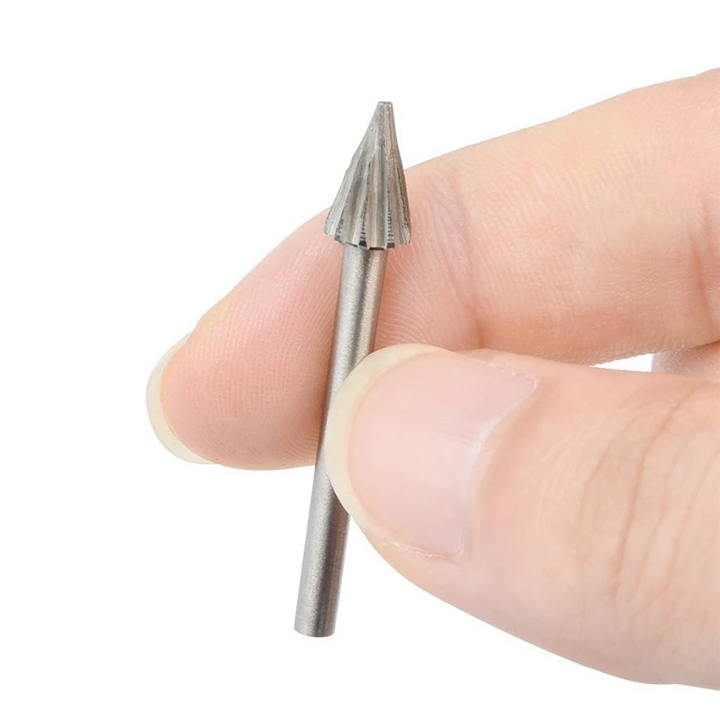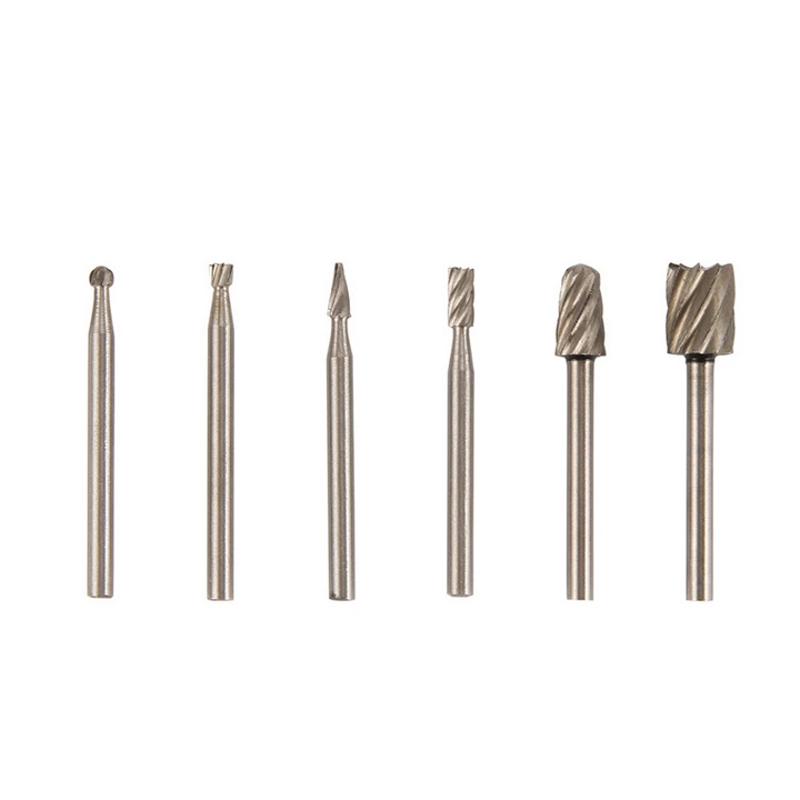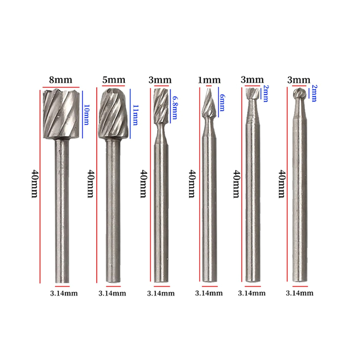 - Bộ sản phẩm gồm 6 mũi khắc, mài, làm lũa, chạm trổ cao cấp dùng để tạo hình, tạo lỗ, rạch khía, làm khe, đục đẽo trên gỗ, kim loại, được làm từ kim loại HSS có độ cứng, sắc và độ bền cơ học cực cao.