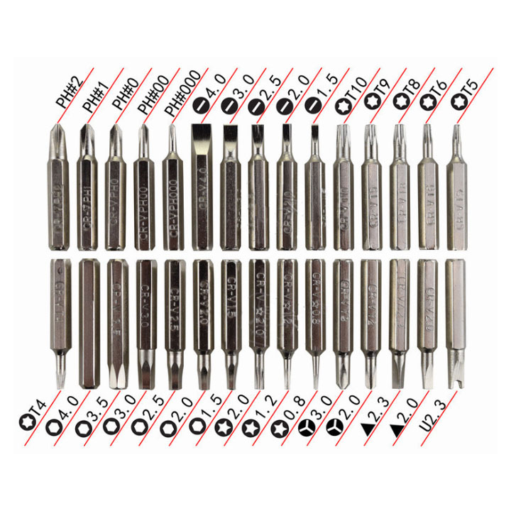 - 12 đầu lục giác: H1.5, H2.0, H2.5, H3.0, H3.5, H4.0, T4, T5, T6, T8, T9, T10.