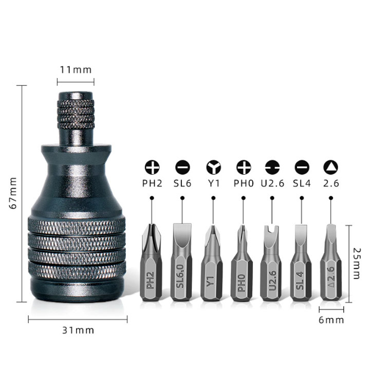 - Loại đầu vít: PH1, PH2, SL3, SL4, Torx T10, T15, T20, Hex 4, Hex 5... (thường 6–10 đầu)