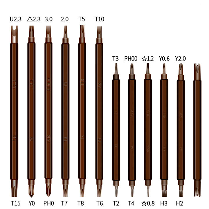 - Đầu vít có 12 thân vít khác nhau bao gồm 25 đầu vít khác nhau