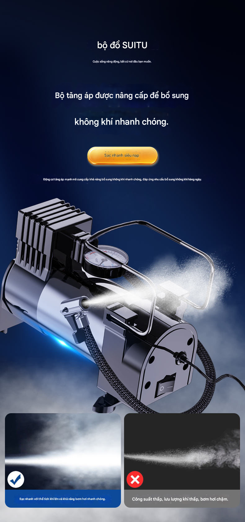 - Ứng dụng: Sản phẩm dùng để - Bơm lốp ô tô nhanh chóng khi lốp non hoặc xì hơi