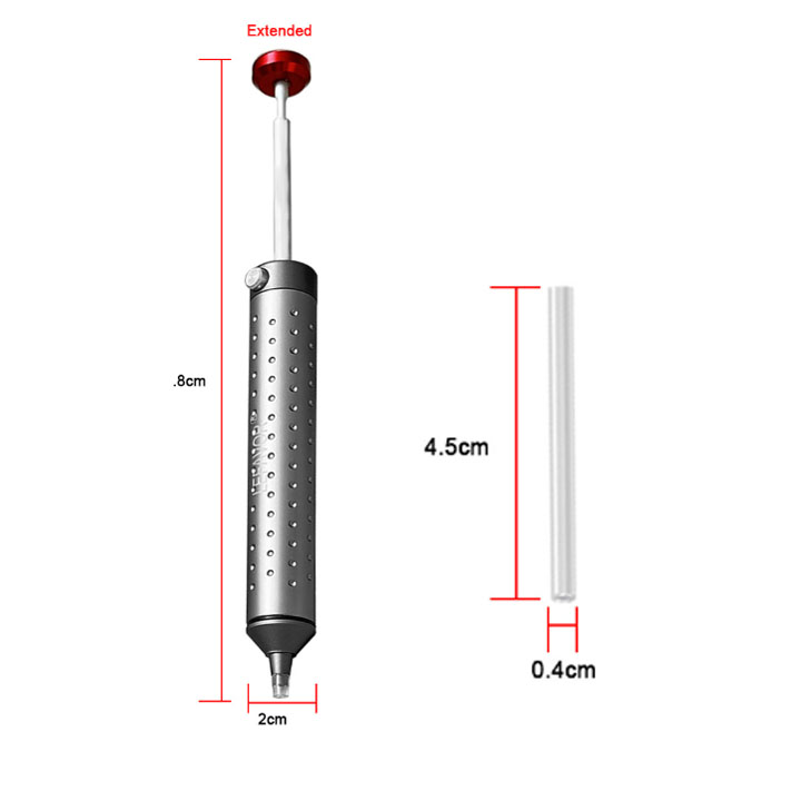 - Kích thước của ống hút hàn là 150x19mm, nó có thể vừa với bàn tay của bạn một cách hoàn hảo cho dù bạn thuận tay trái hay thuận tay phải. Bơm hút thiếc này có thân kim loại và chân không áp suất cao để giúp bạn hút đi chất hàn một cách hiệu quả.