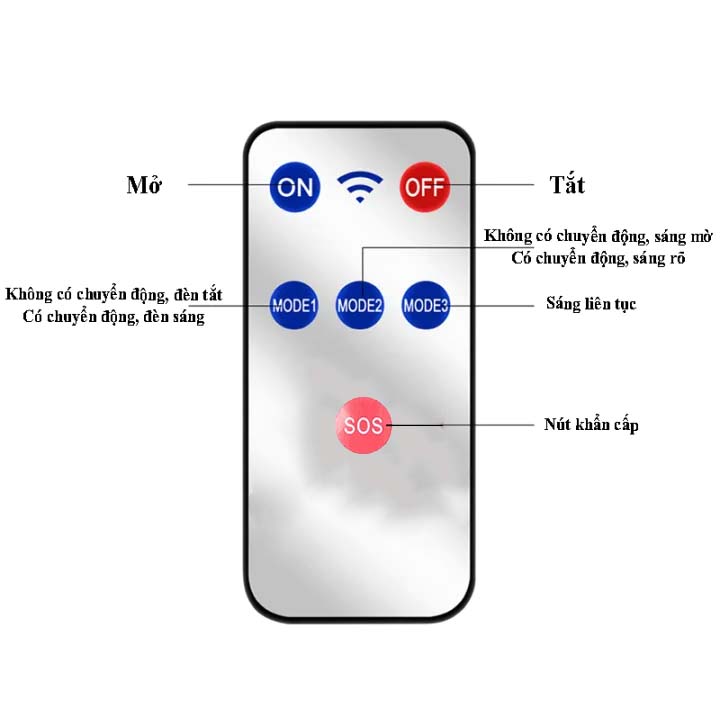 - Chế độ chức năng: Chiếu sáng cảm biến Ánh sáng nhẹ, Cảm biến ánh sáng mạnh Không có ánh sáng, Ánh sáng liên tục.