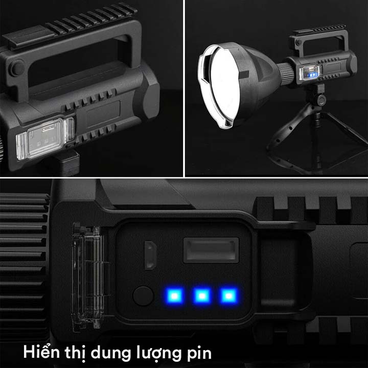 - Đèn sạc siêu sáng sử dụng nguồn là pin sạc lithium tích hợp sẵn trong thân máy 3 quả pin 18650, khi hết pin có thể sạc lại thông qua cổng micro USB, ngoài ra đèn pin cũng được trang bị một cổng sạc cho các thiết bị như : điện thoại, máy tính,... rất thuận tiện cho người dùng. Ngoài ra đèn có khả năng chống nước đáp ứng theo tiêu chuẩn IPX6 nên các bạn có thể sử dụng trong nhưng điều kiện thời tiết không được thuận lợi như : mưa, bão,...