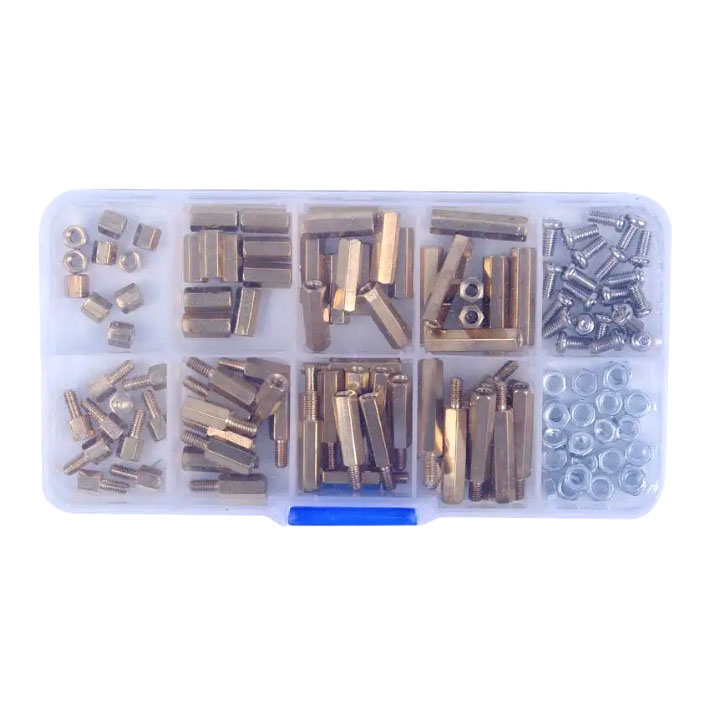 Trụ đồng : M3, 10mm+6mm, 10 cái; Trụ đồng : M3, 15mm+6mm, 10 cái; Trụ đồng : M3, 20mm+6mm, 10 cái ; Đai ốc: M3, 20 cái ; Vít: M3 x 6mm, 20 cái
