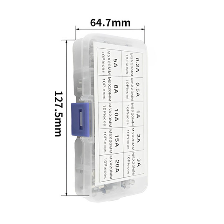 - Mỗi loại gồm 10 chiếc cầu chì ống thủy tinh 5x20