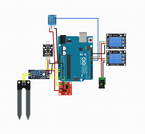 - Khi nhiệt độ, độ ẩm giảm quá mức cho phép relay sẽ bật cho máy bơm hoạt động.
