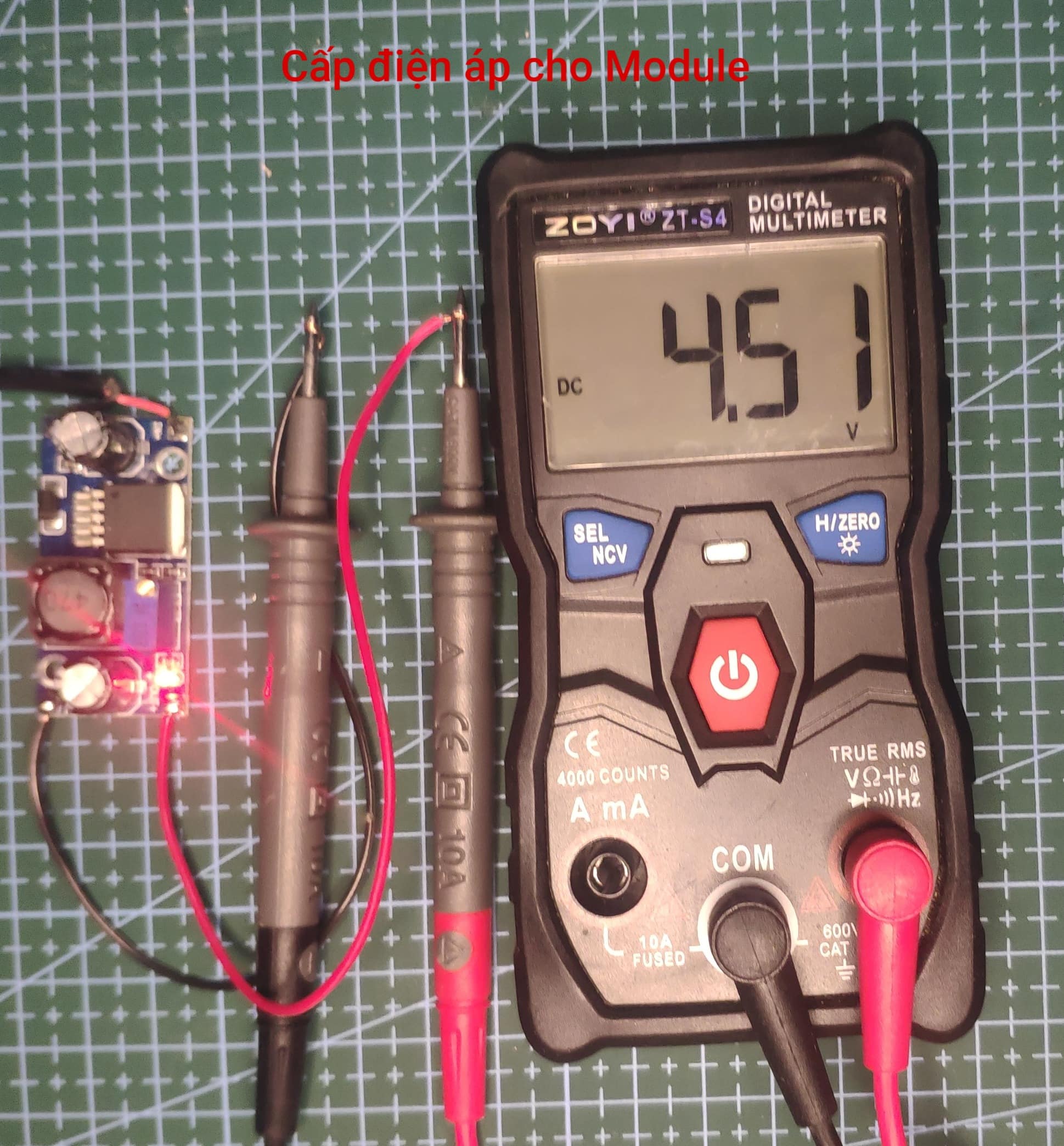BƯỚC 1: Kết nối nguồn vào cho MODULE từ 4-35VDC, dương nguồn nối với IN+, âm nguồn nối với IN-, đèn sáng.