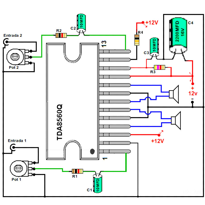 - 2 × 25W trên tải 4Ω với nguồn cung cấp 13.2V.
