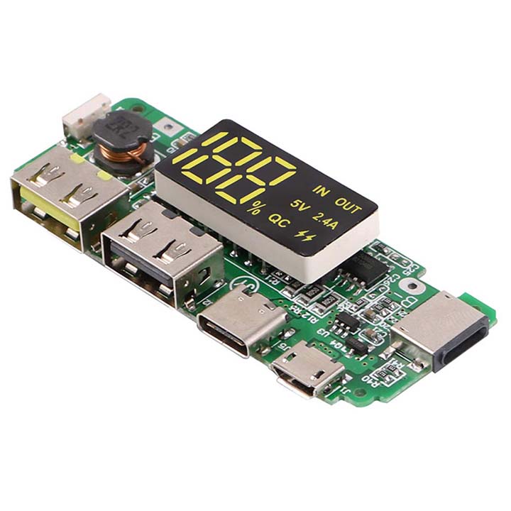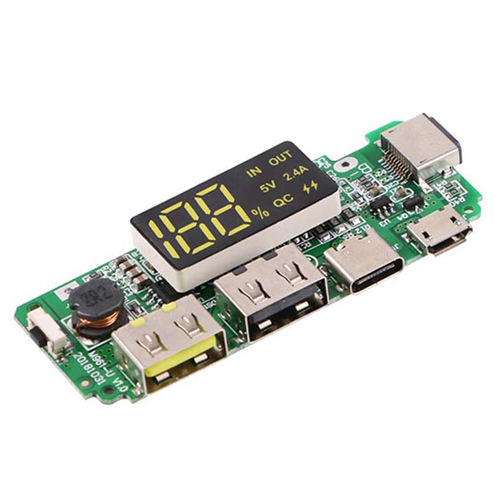 - Mạch sạc nhanh Pin 18650 5V 2.4A là một mạch sạc cung cấp điện dự phòng di động với đầu vào tương thích với bộ chuyển đổi 5V để sạc pin. Mạch sử dụng pin tích hợp cho thiết bị di động, nguồn cung cấp là 5V qua USB 2.0 cho các thiết bị bên ngoài.