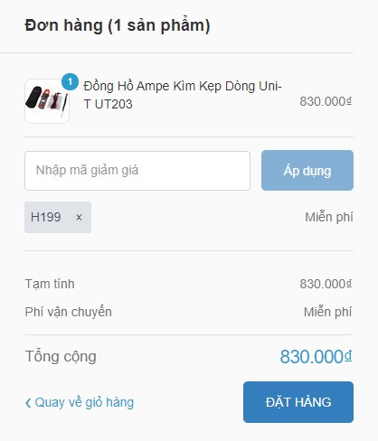 - Sau khi điền xong thông tin, khách hàng nhập mã H199 vào ô "Nhập mã giảm giá", chọn Áp dụng hệ thống sẽ tự động trừ phí vận chuyển cho quý khách: