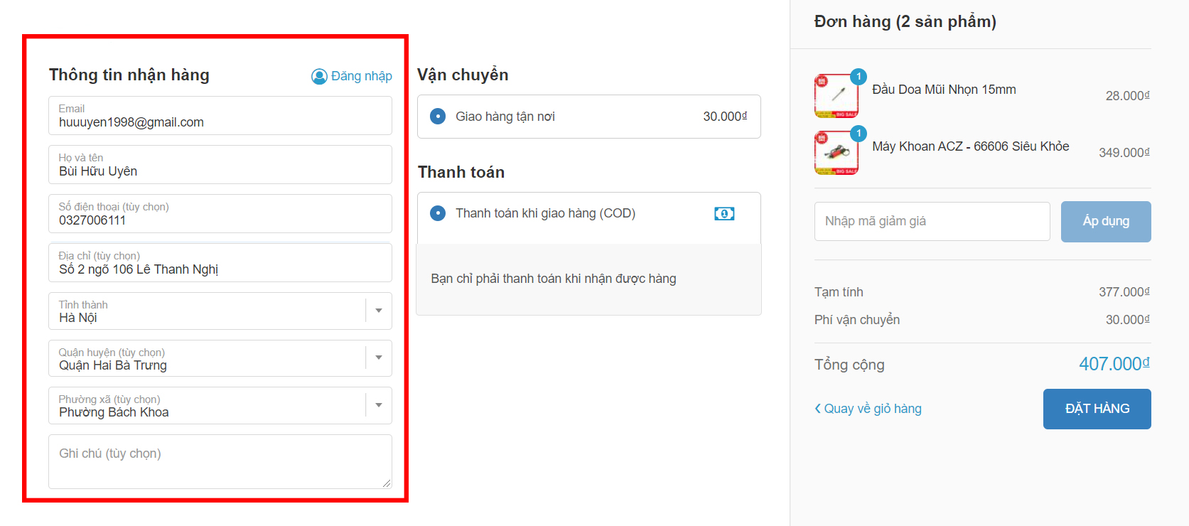 - Khách hàng điền đầy đủ thông tin cần thiết: Họ và tên, Số điện thoại, Địa chỉ (bao gồm số nhà, đường, vị trí đặc biệt...), Tỉnh thành, Quận huyện, Phường xã,... đây là thông tin giúp hệ thống tạm tính phí vận chuyển cho đơn hàng.