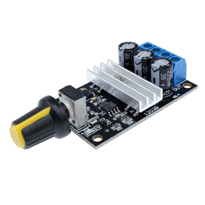 - Mạch điều khiển tốc độ động cơ PWM 5V-28V 3A được thiết kế nhỏ gọn và cách sử dụng đơn giản với 2 chân nguồn vào và 2 chân ngõ ra điều chỉnh bằng chiết áp, chu kỳ điều chỉnh được từ 5% - 100% của điện áp ngõ vào.