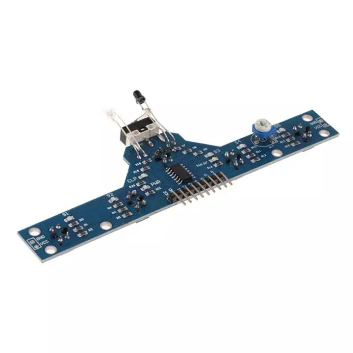- Dùng để phát hiện line đen và line trắng. Trên thanh cảm biến có 5 cảm biến hồng ngoại hướng xuống đất nhằm phát hiện line, một cảm biến hồng ngoại đặt phía trước và đi cùng với nó là một công tắc hành trình báo hiệu đã đụng vật. Tín hiệu ngõ ra dạng số dễ dàng cho việc xử lý.